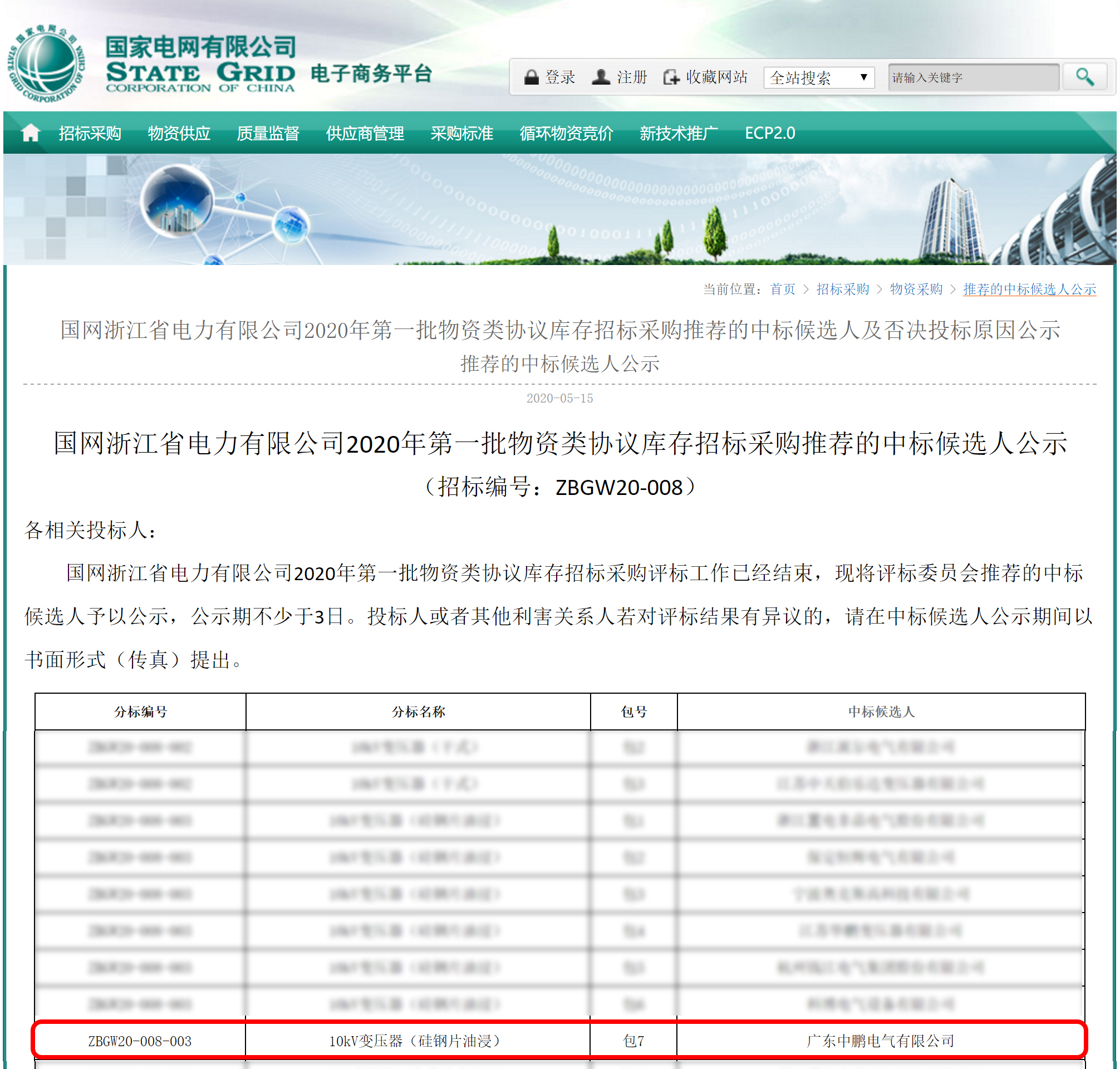 近日,國網浙江省電力有限公司發布2020年第一批物資類協議庫存招標采購結果,中鵬10kV油浸式變壓器成功入圍該采購項目,中標金額達1371萬元。